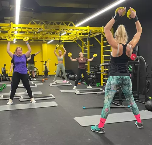 Вторая часть — это силовая тренировка с использованием степ-платформы и иного оборудования.